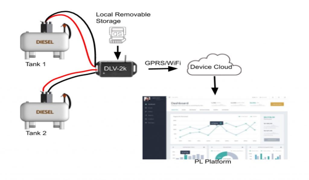 The DLV-probe uses a non-invasive technique to monitor the level of diesel left in the tank and sends that information to the DLV Box which stores the data at every point in time and forwards that data to our cloud PL Platform where the data is analyzed in