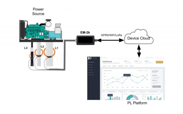 The EM-2k is designed to measure and record power being supplied (or consumed) in a three(3)-phase system. As such, it comes with (3) three integrated flexible Rogowski coil, and 3 three voltage probes to measure and record the TRMS(true root mean square) value of AC Current and Voltage (respectively) for up to 600V at 2500A. The voltage and current obtained are used in determining the power, and all the data is sent, wirelessly(via WiFi, GSM, or LoRa) to our cloud-based platform, where the raw data and actionable insights generated from its analysis, can be viewed in real-time.